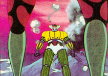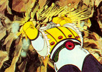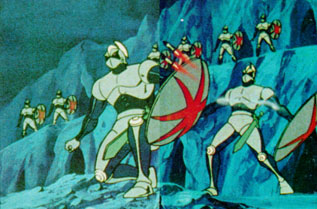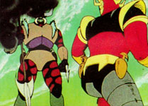 ...ed ecco Hiroshi, ancora una volta nelle vesti dell'invincibile robot d'acciaio, pronto a battersi ed annientare il gigante Haniwa che gli sbarra la strada.