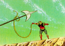 Senza indugio, il giovane si accinge ad affrontare l'avversario e, come prima mossa, riesce ad afferrare la gigantesca lancia che il mostro impugna...